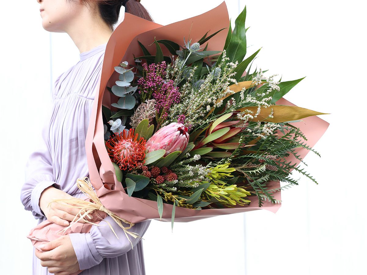 季節のプロテアを束ねたおまかせフレッシュブーケ(赤・ピンク系)