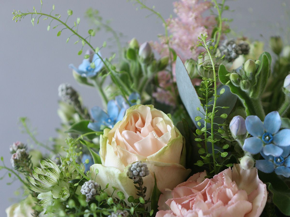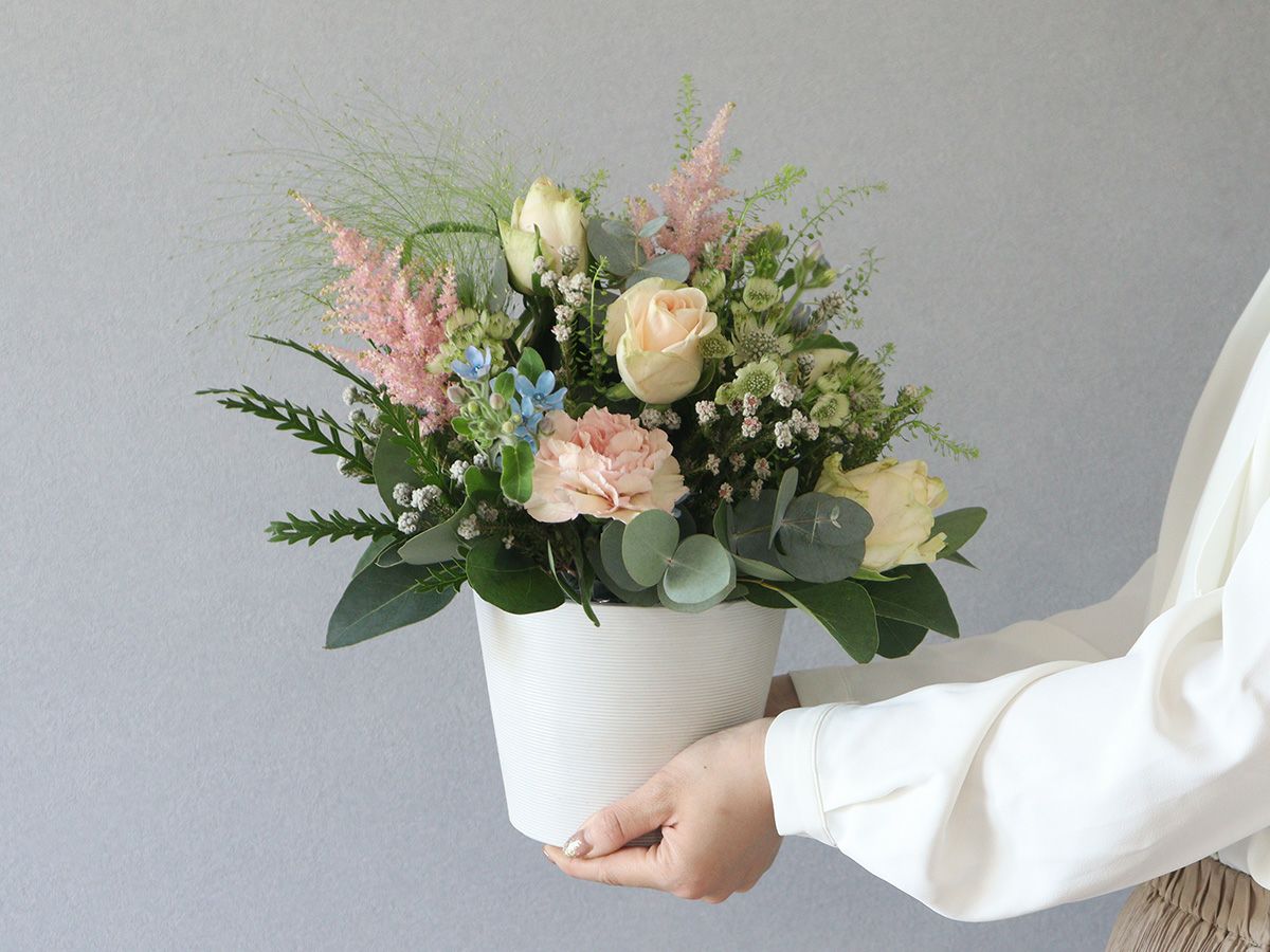 繊細な小花を合わせて、ふんわりとしたペールカラーアレンジメントにまとめました。