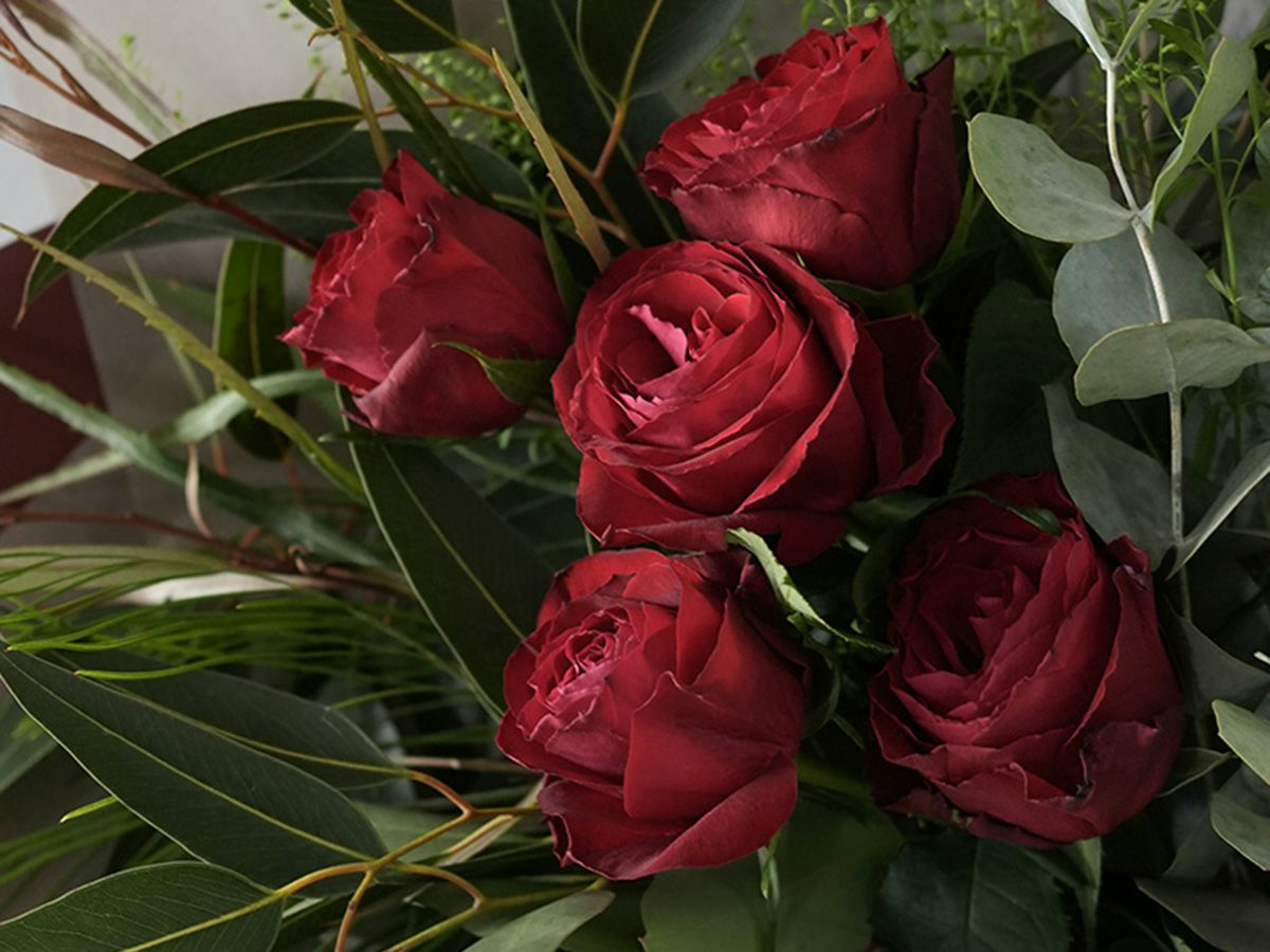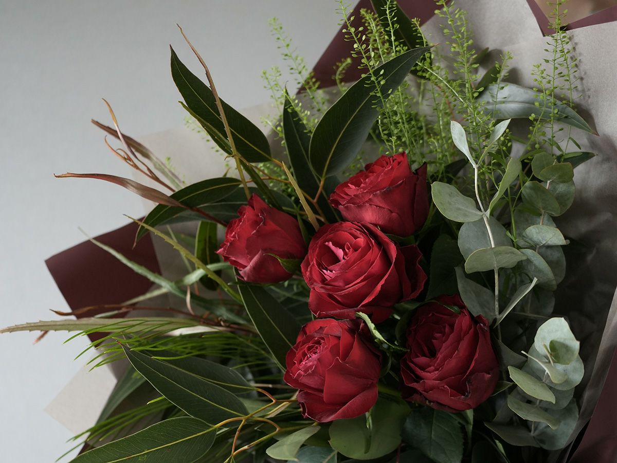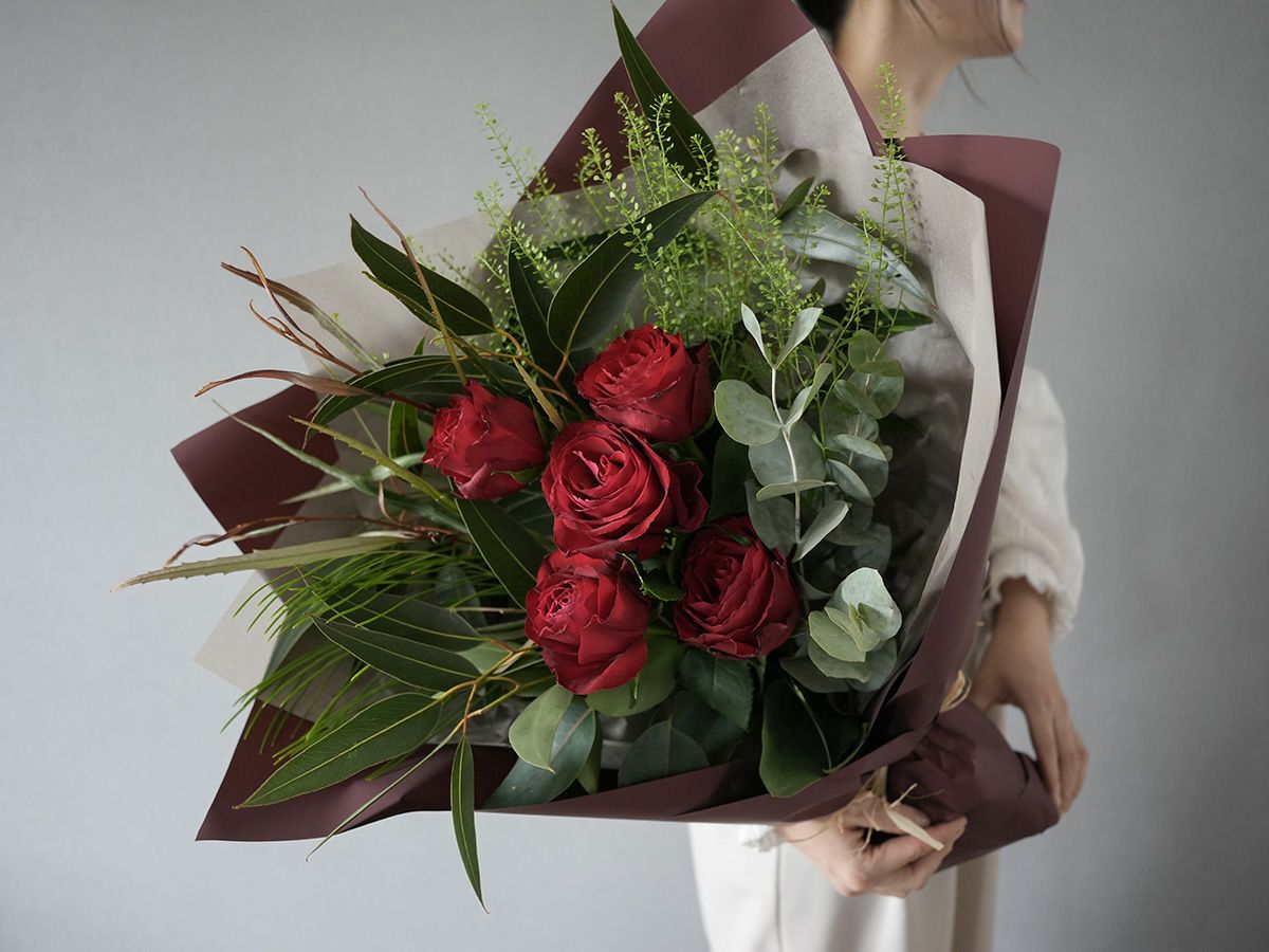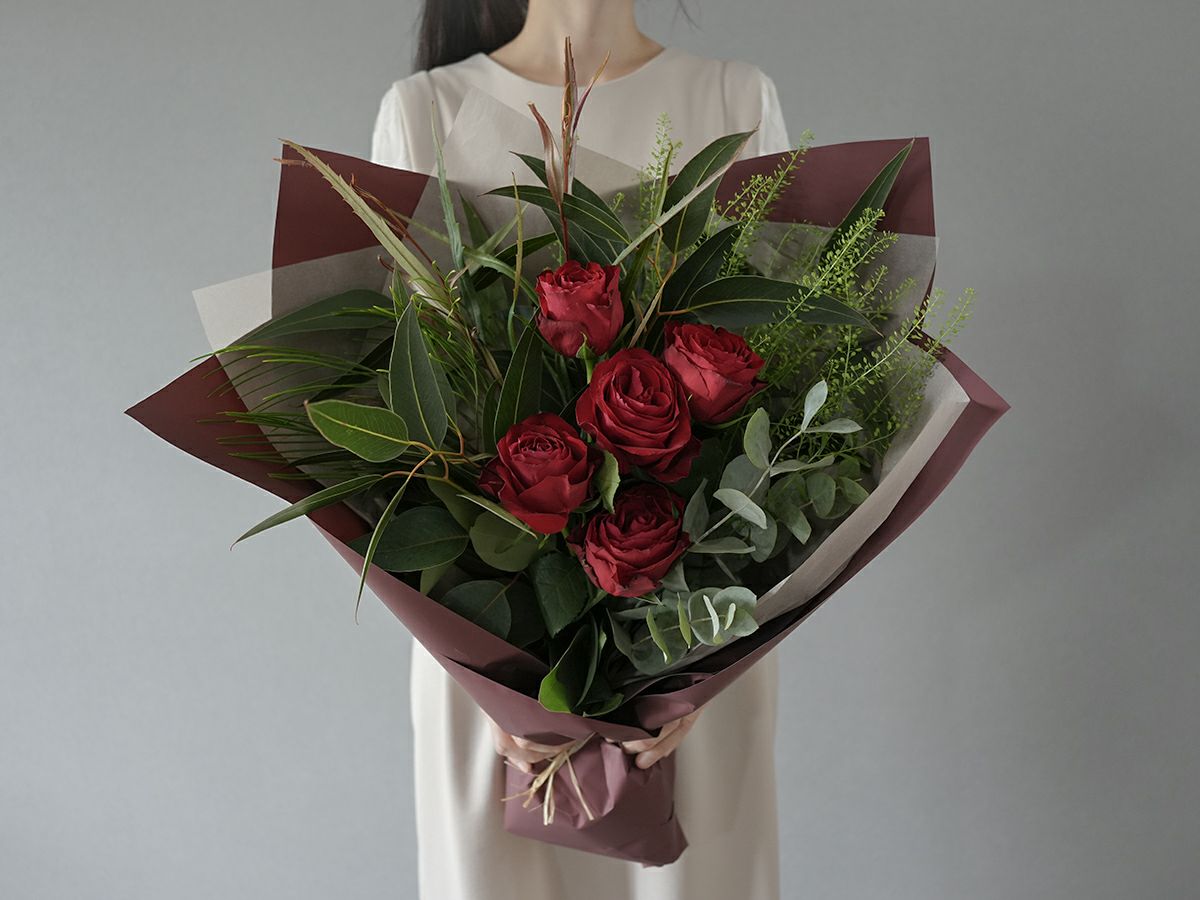 ソジャンミ農園のローズブーケ:マダムレッド5本と季節のグリーン