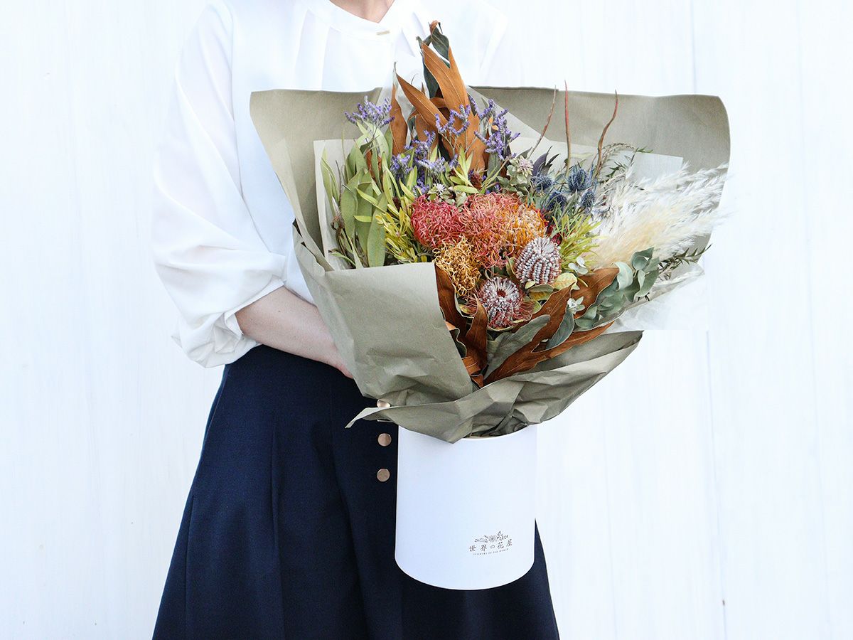 裁縫で使う針刺しのような形をしていることからピン(針)のクッションで、ピンクッションと呼ばれているこの花。「いつでも成功を」「降り注ぐ愛」など、ポジティブな花言葉を持っています。ドライフラワーにしても赤や黄色の色が鮮やかに残り、”ピン“ の部分が繊細で華やか。小さなバンクシア、コクシネアや様々な世界の草花を束ね、飾りやすく、お渡ししやすい当店オリジナルフラワーボックスにセットしてお届け。