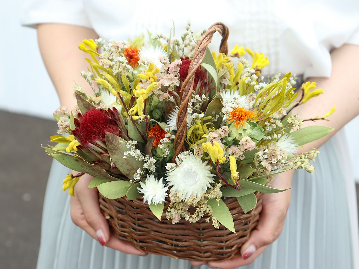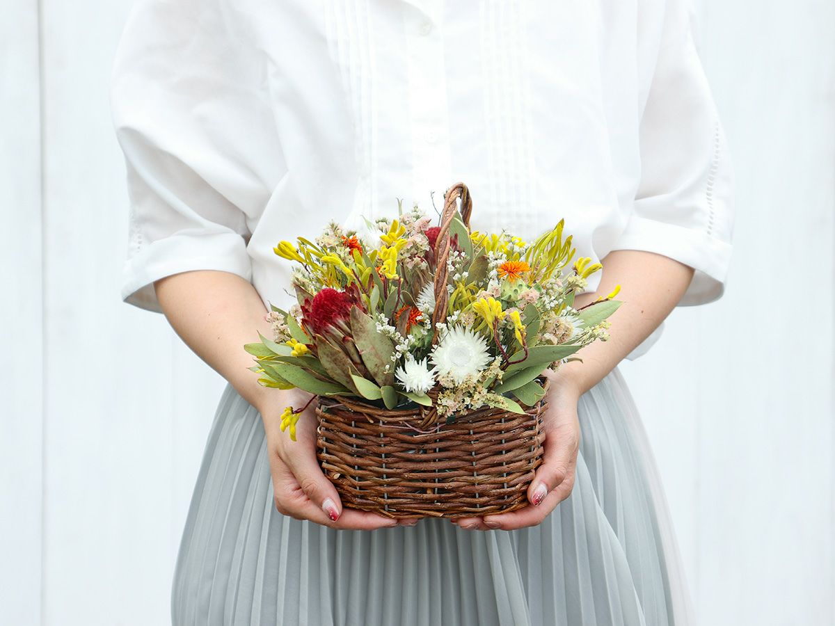 ちいさな赤いプロテア ロビンやケープスノー、リューカデンドロンなど、南アフリカから届くネイティブフラワーをアレンジ。それぞれユニークな中輪から小輪のドライフラワーをセレクトしました。明るい色味で華やかに仕上げています。