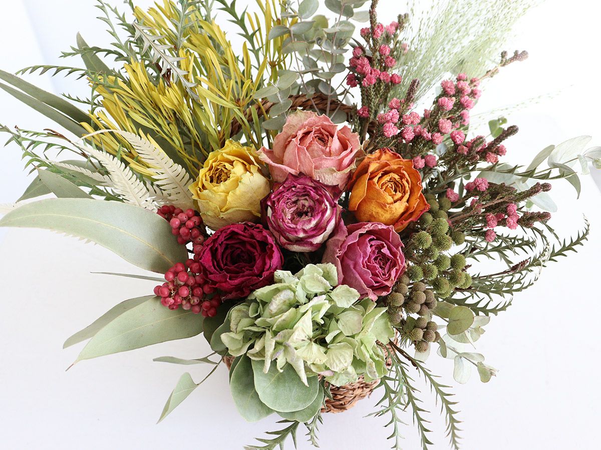 大輪のドライローズバスケットアレンジメント