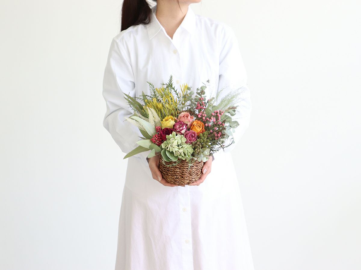 そのまま置いて飾れるように、バスケットにアレンジしてお届けいたします。