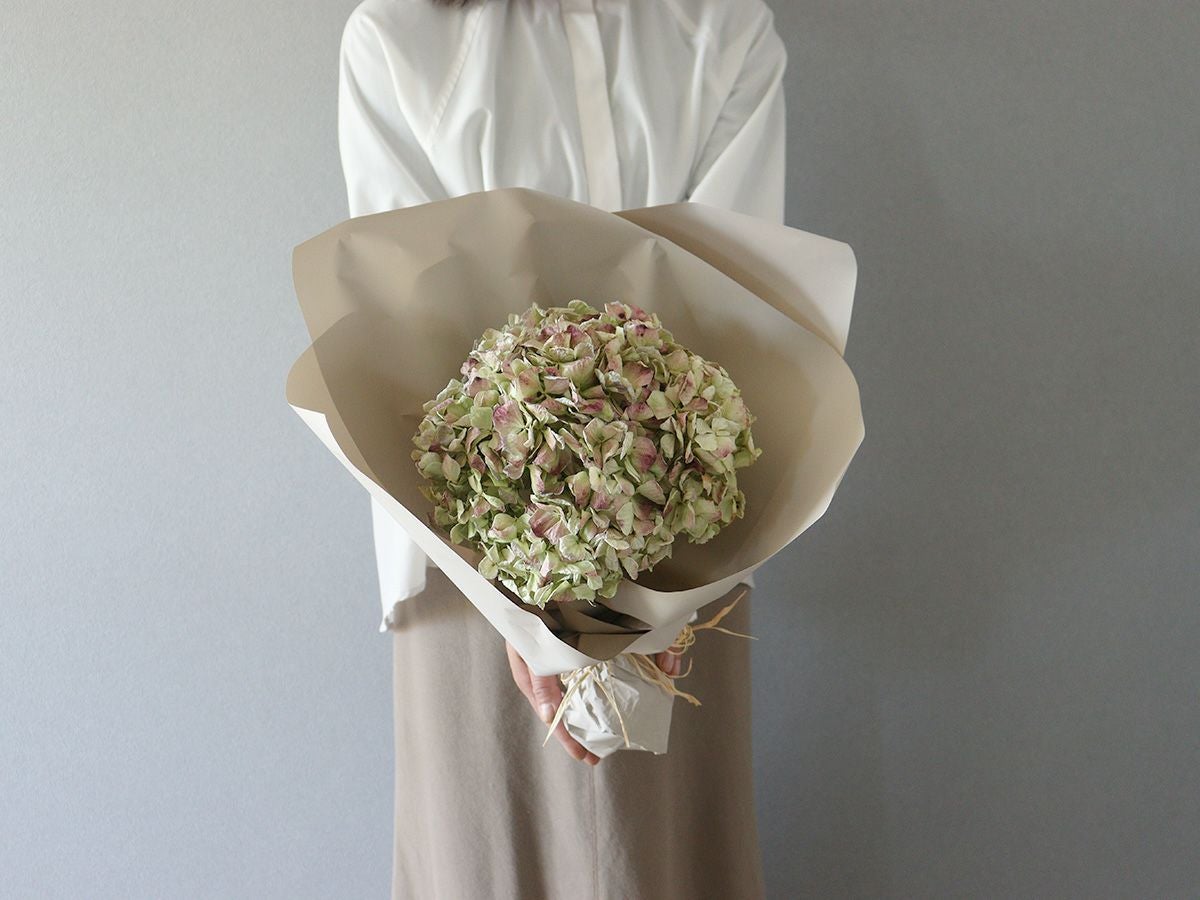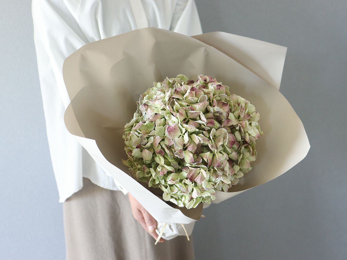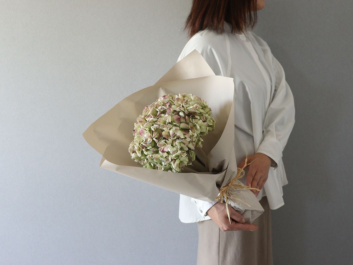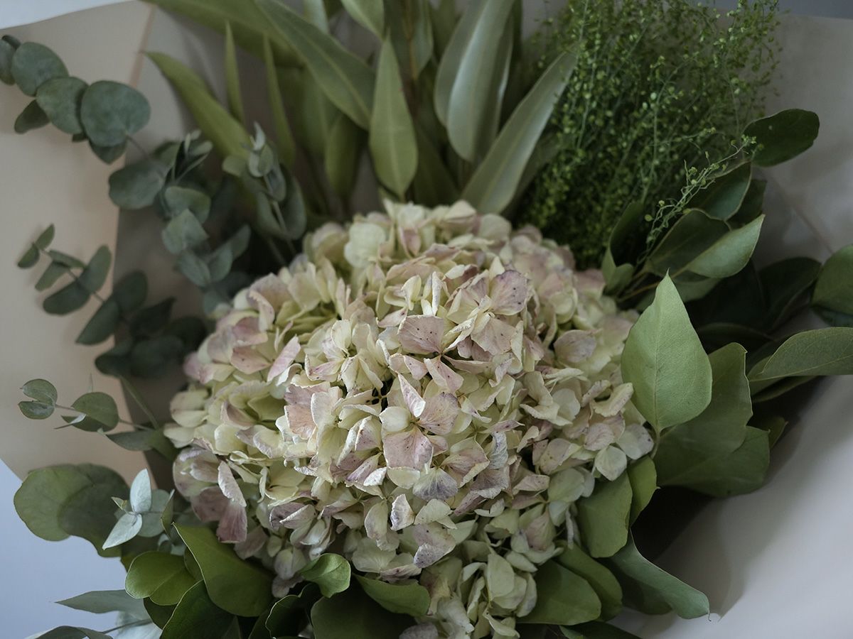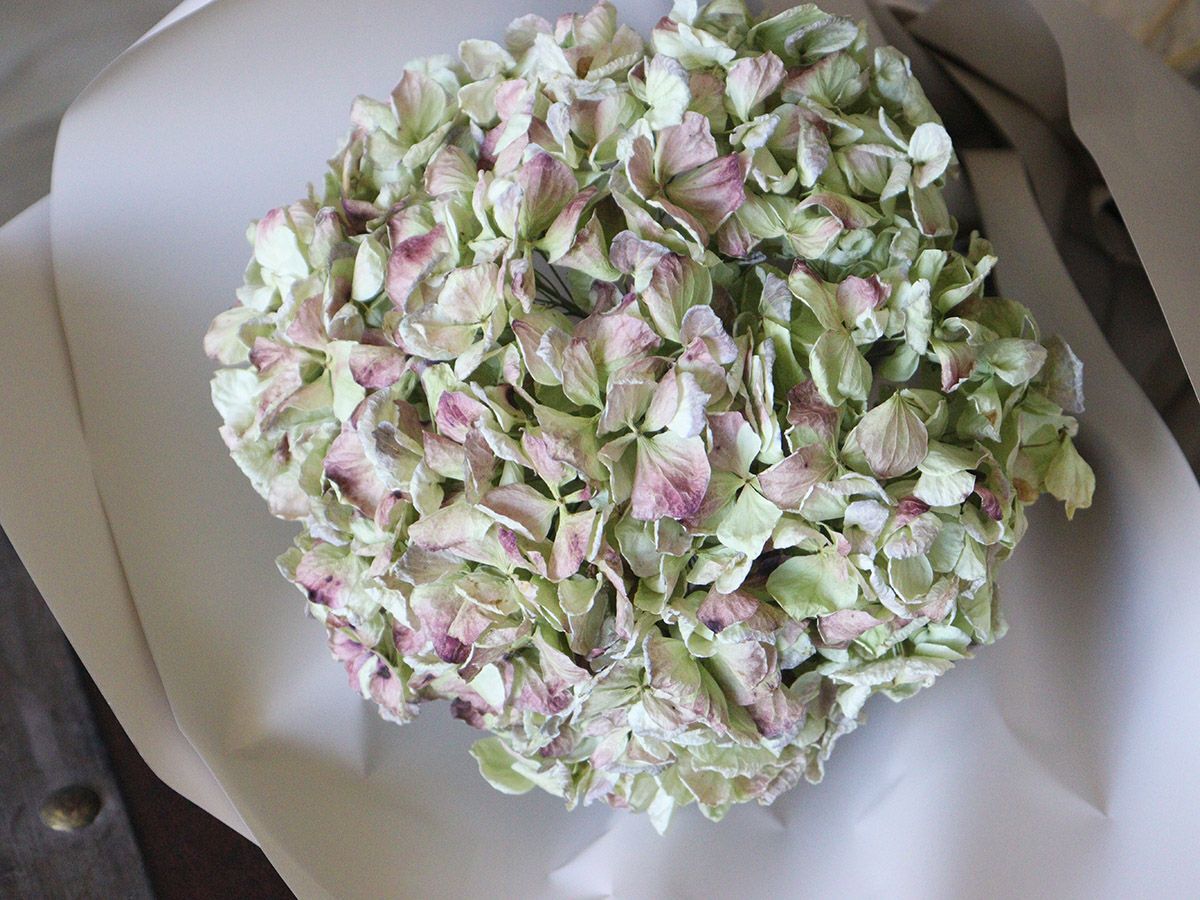 コロンビアから届いたアジサイとグリーンを束ねたドライブーケ