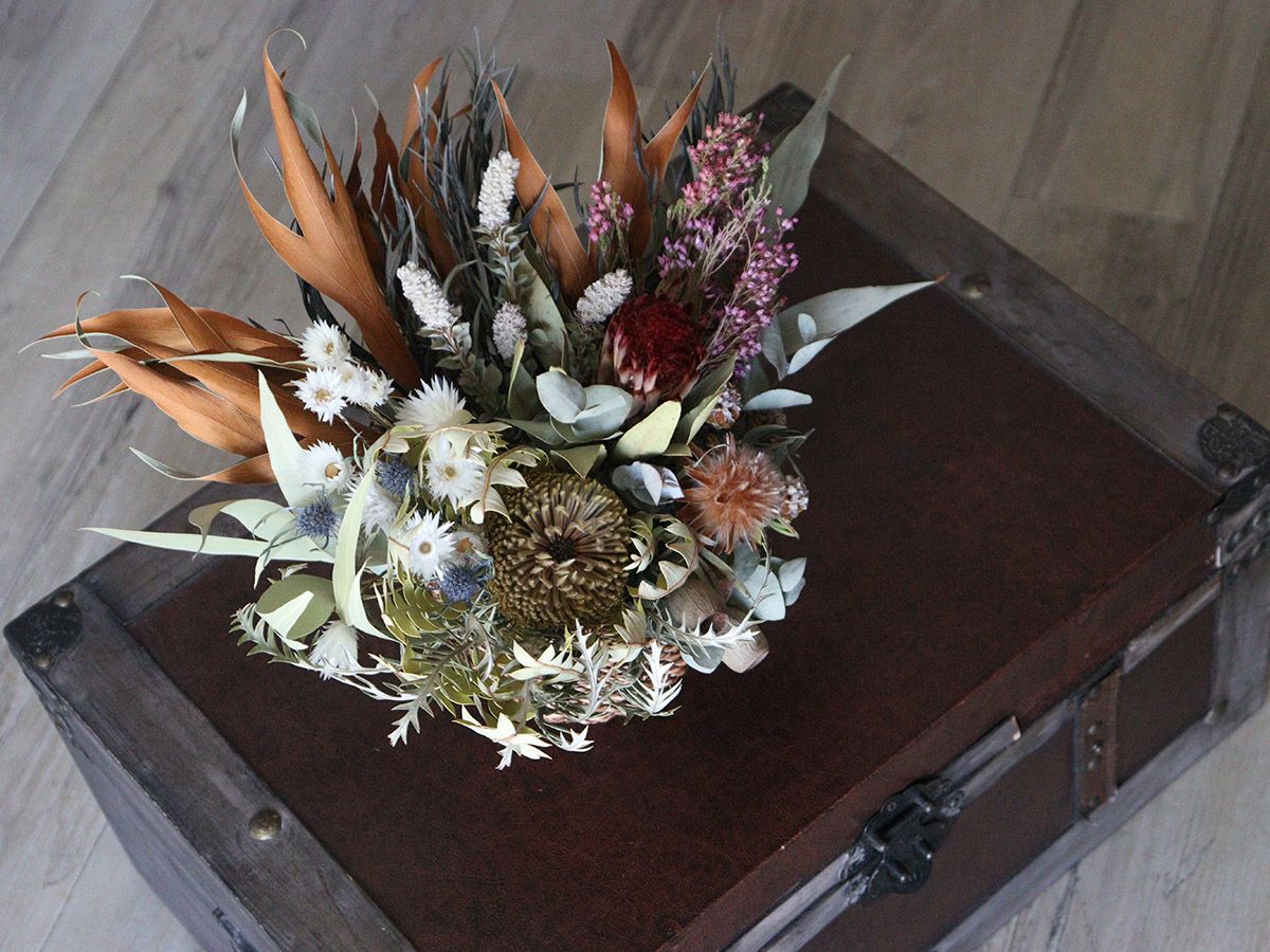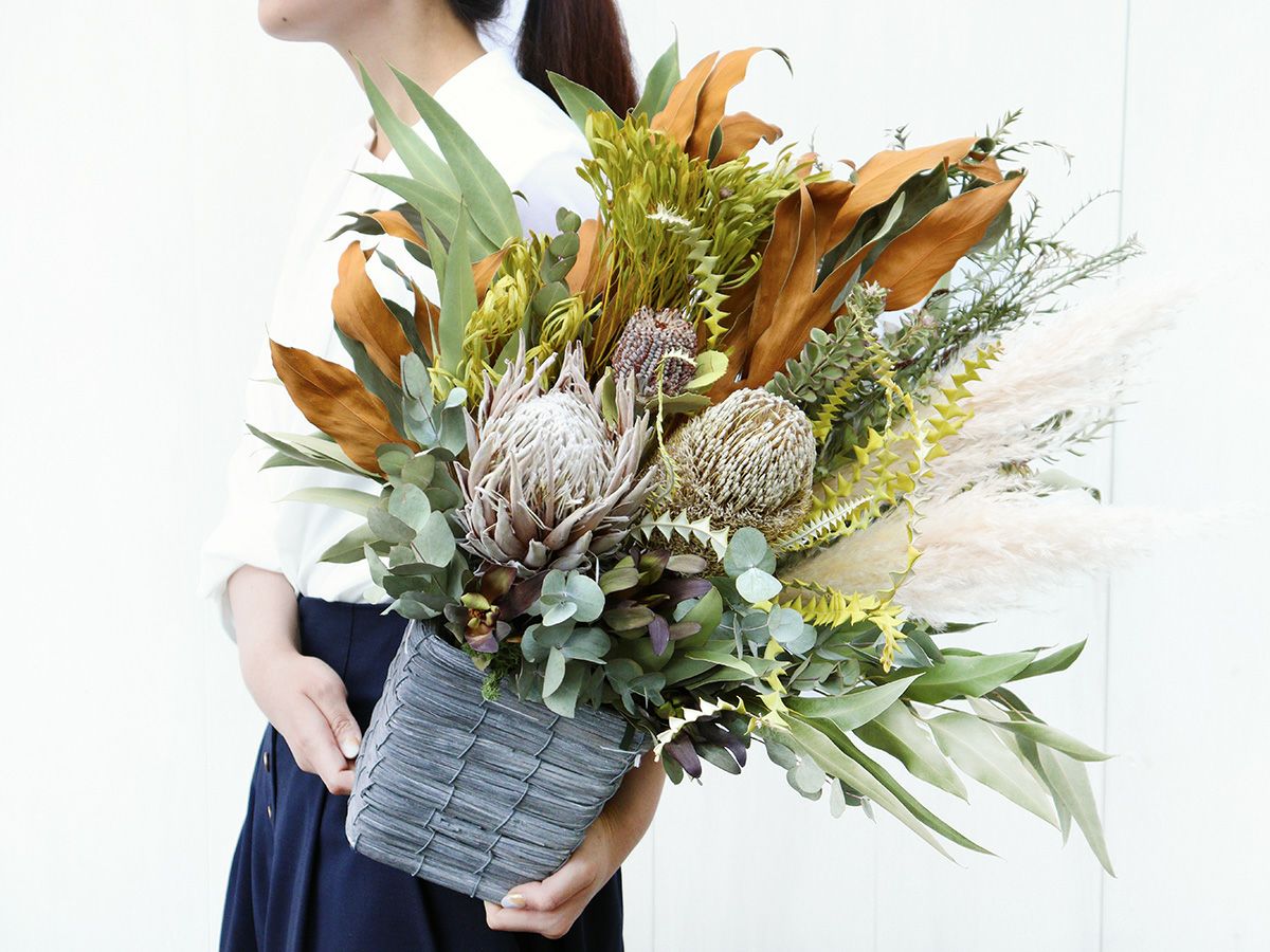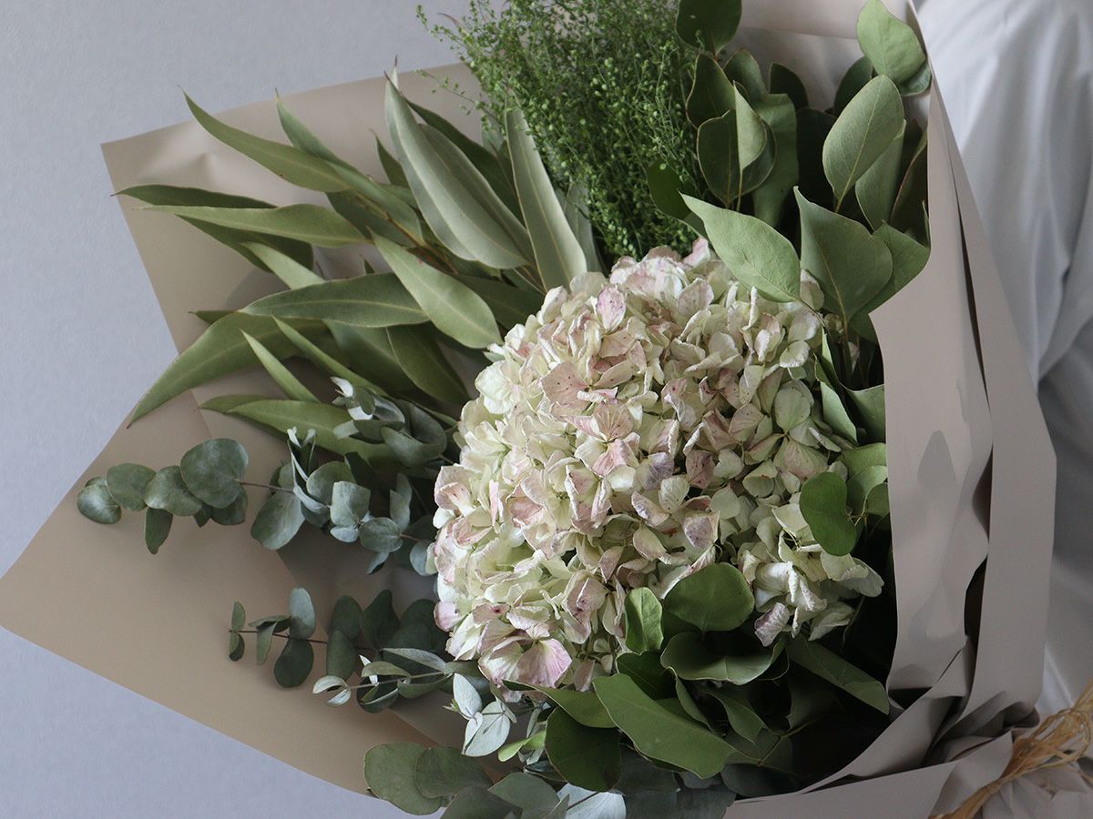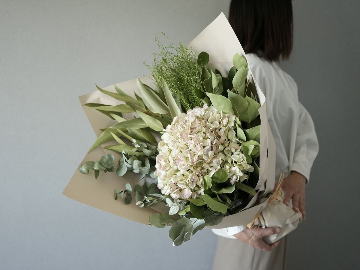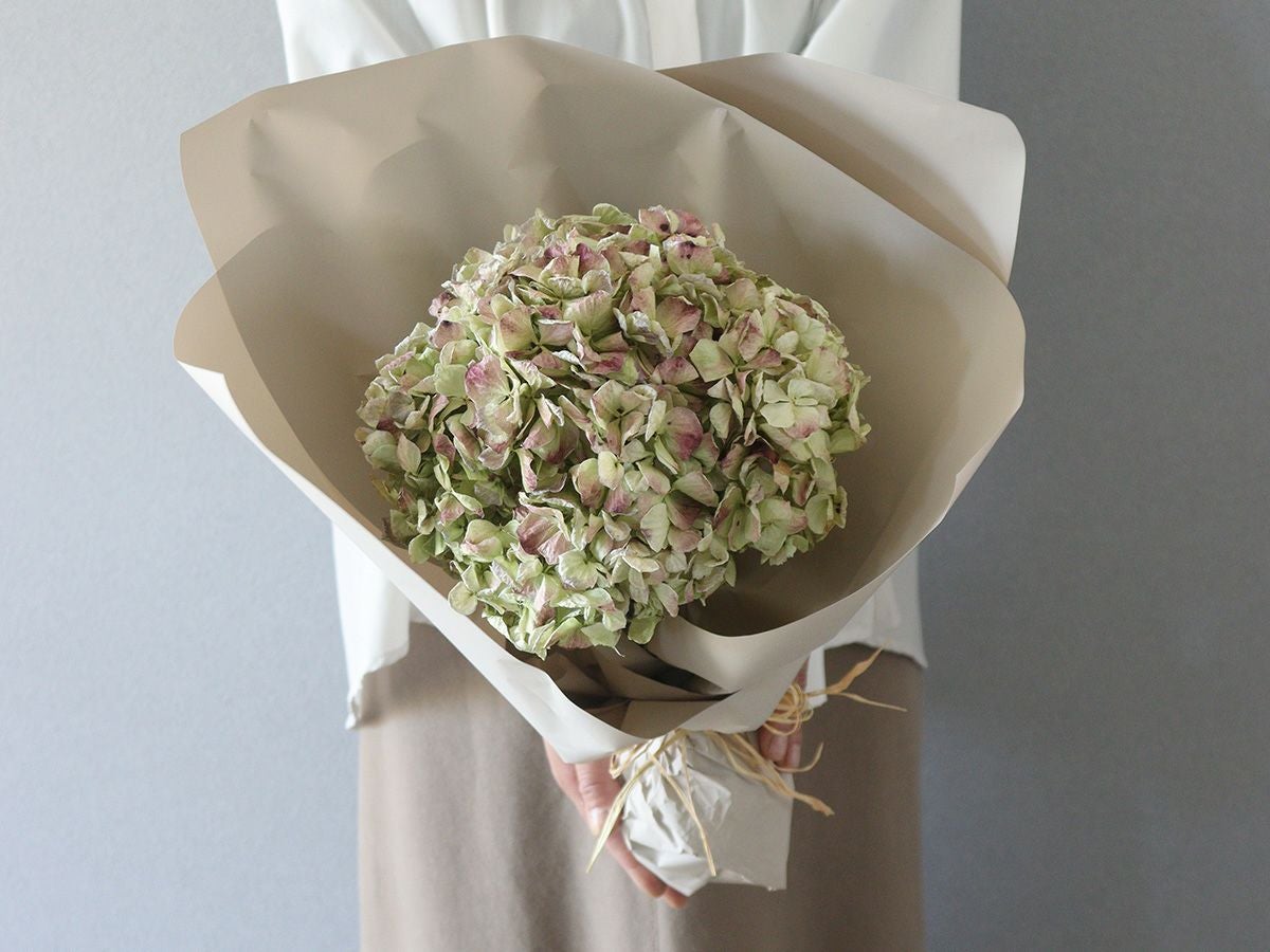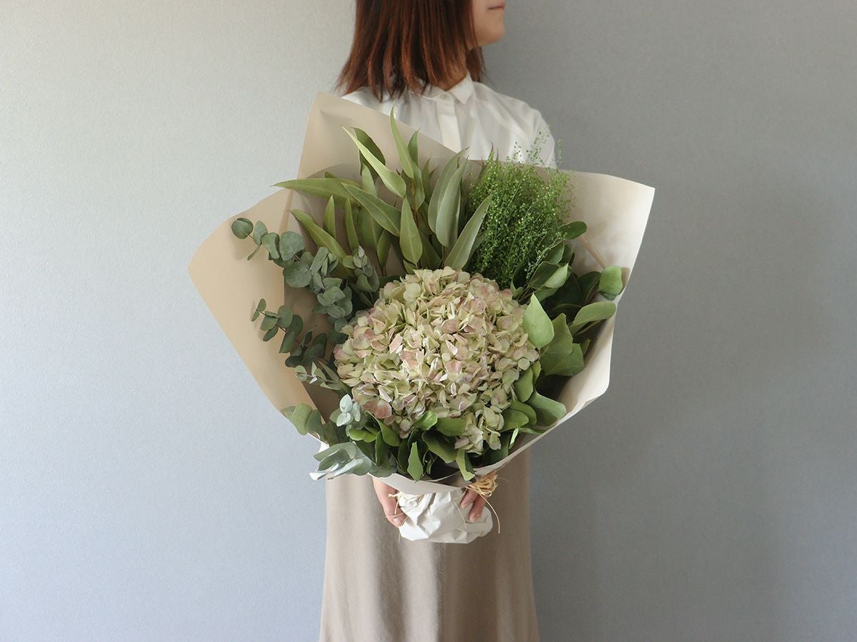 コロンビアから届いたアジサイとグリーンを束ねたドライブーケ