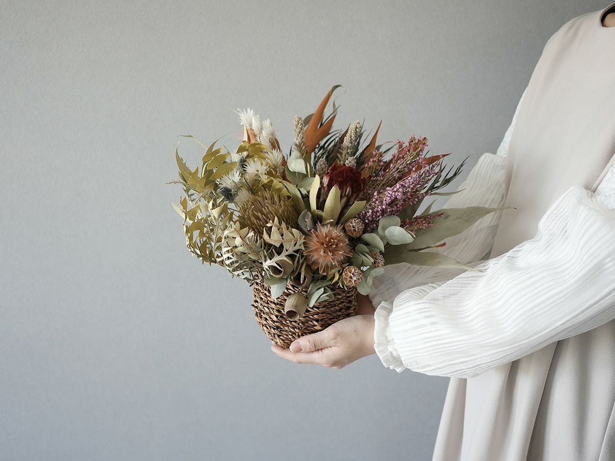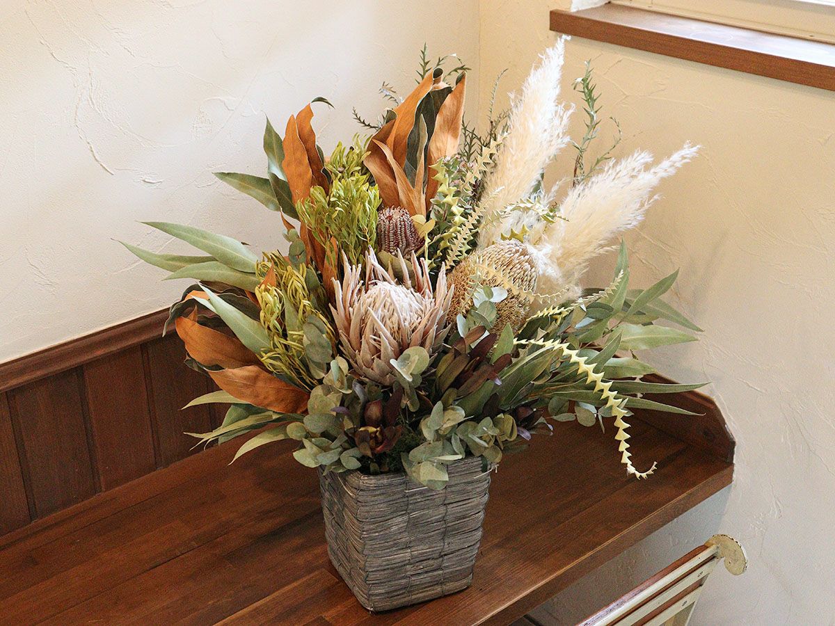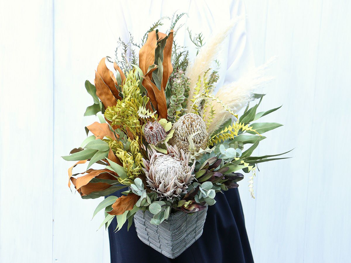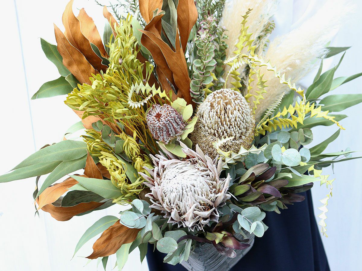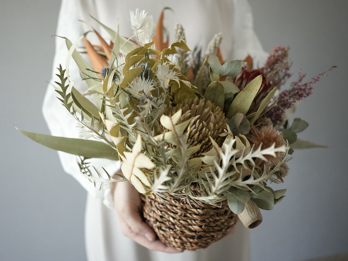 コロンビアから届いたアジサイとグリーンを束ねたドライブーケ