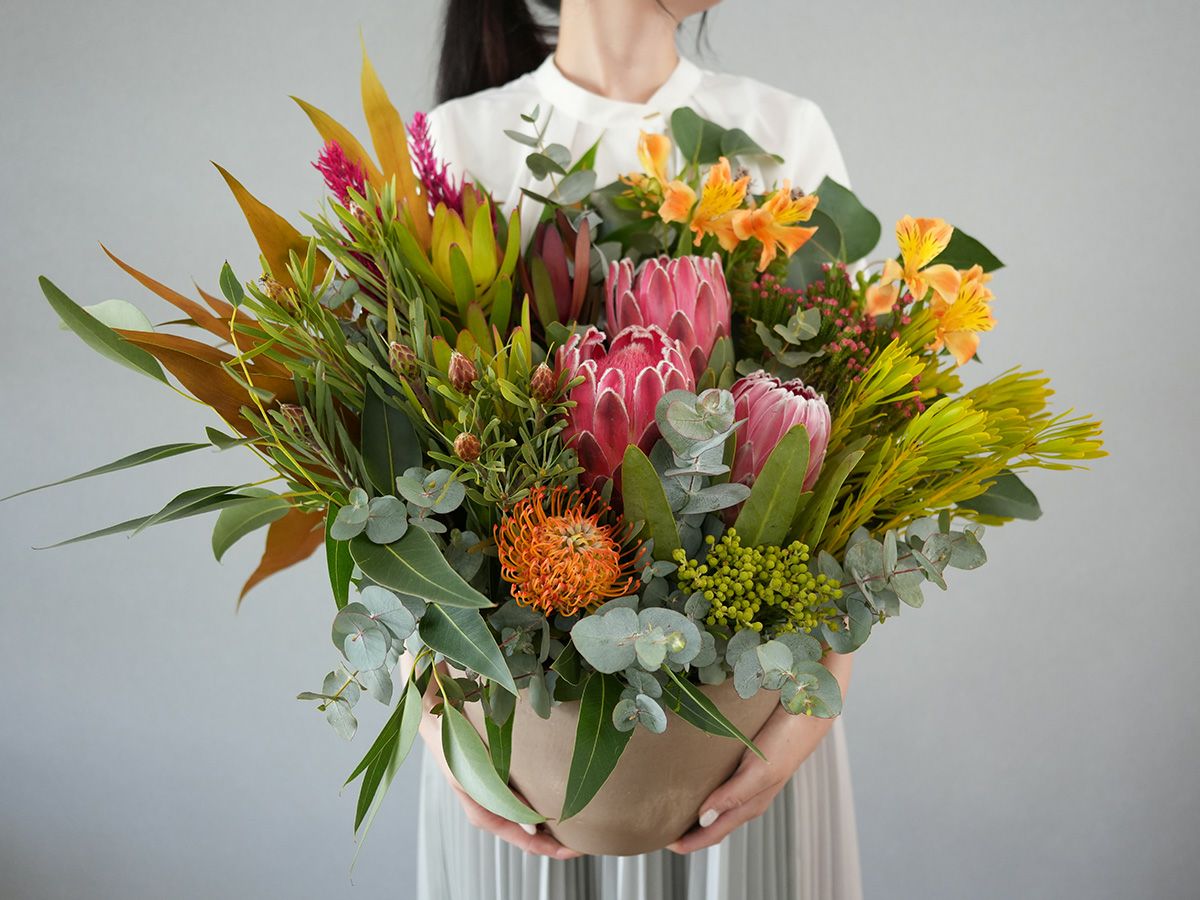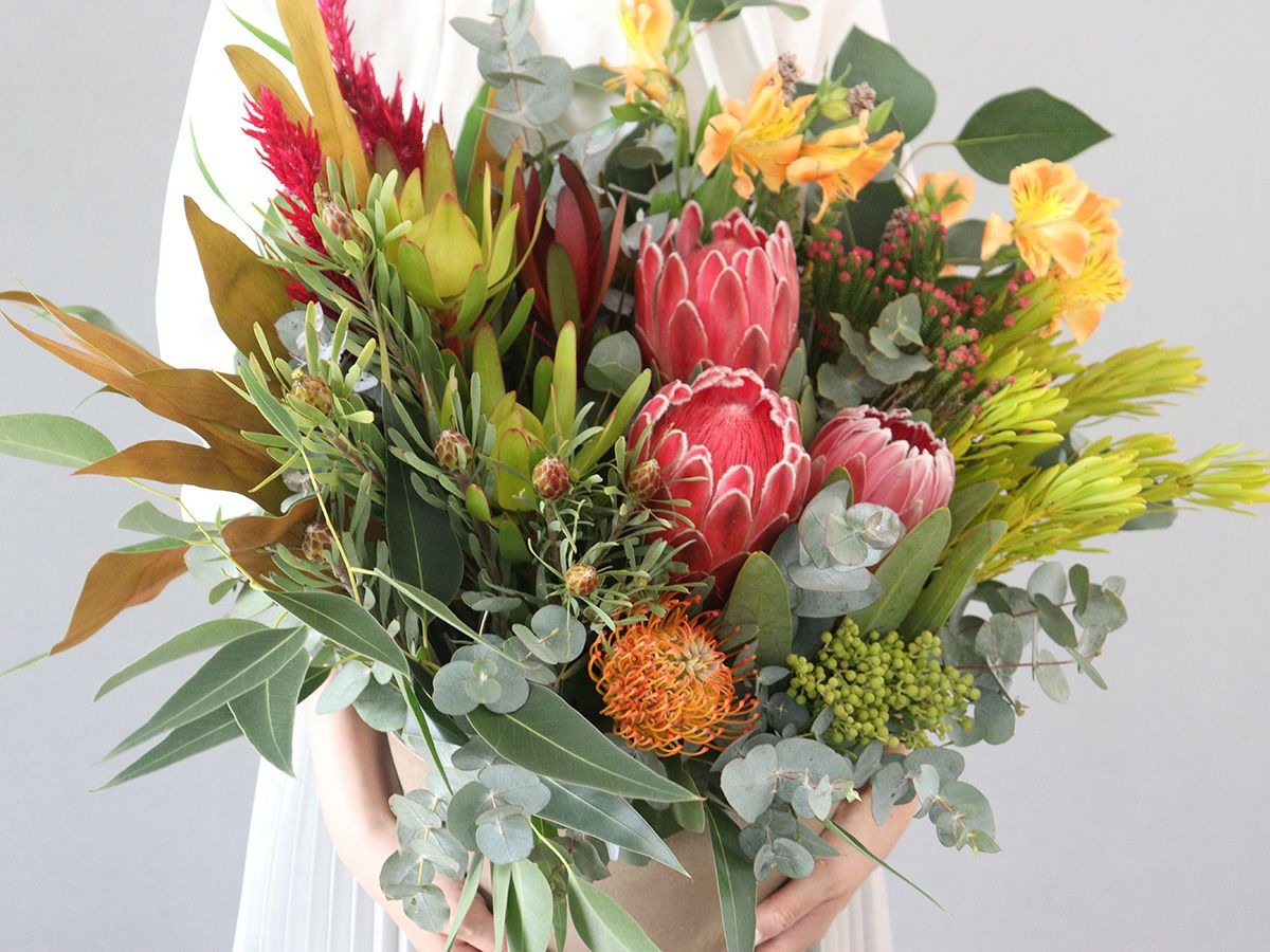 この2本のヴィーナスに、異なる品種1本を加えた、3本のプロテアを使った華やかなアレンジメント。南アフリカの大地の香りをほんのり感じられるような、ネイティブフラワー中心の生き生きとしたデザインに仕上げています。