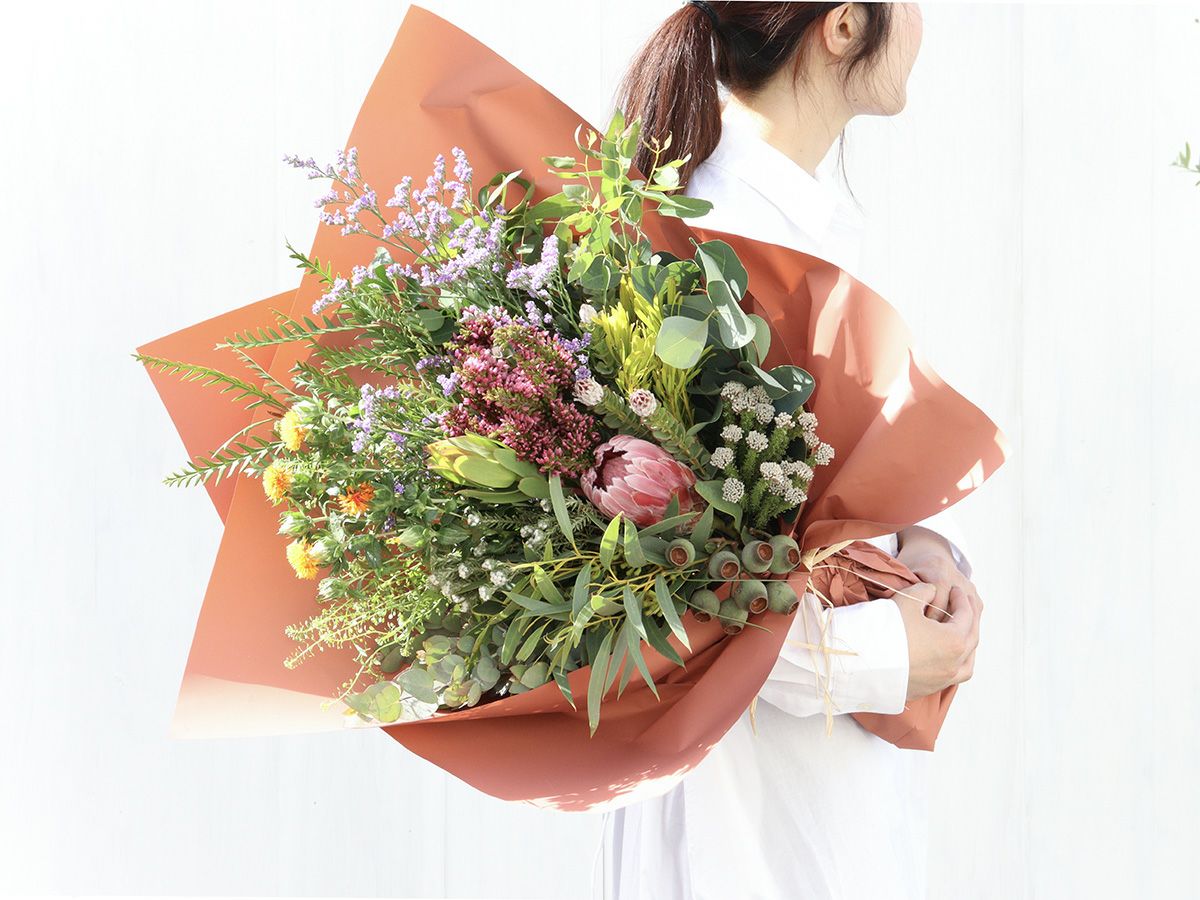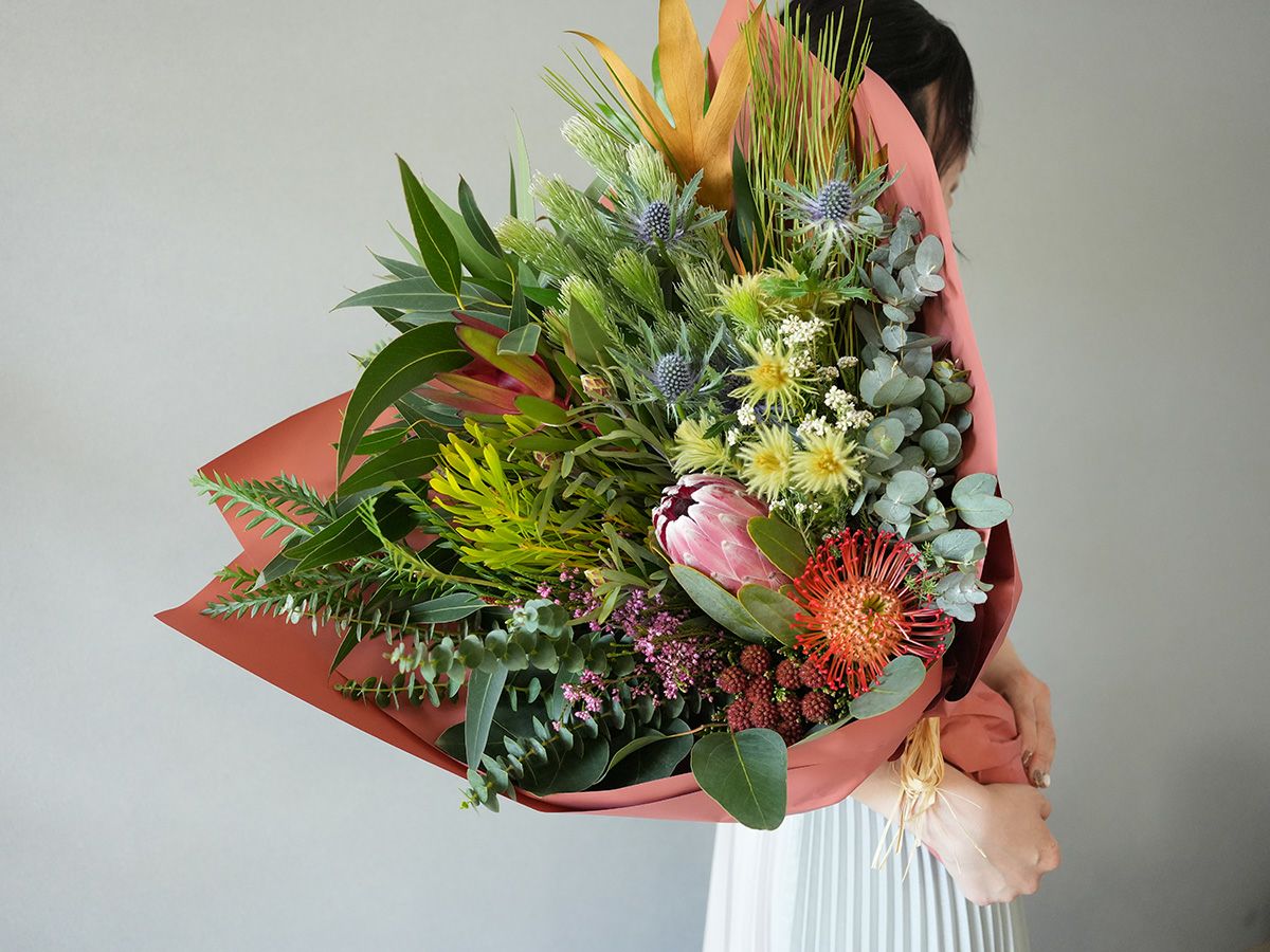 季節の移り変わりと共に、その時々に届く様々な品種の中からピックアップしたプロテアをメインに、各国の草花を取り合わせたブーケ。