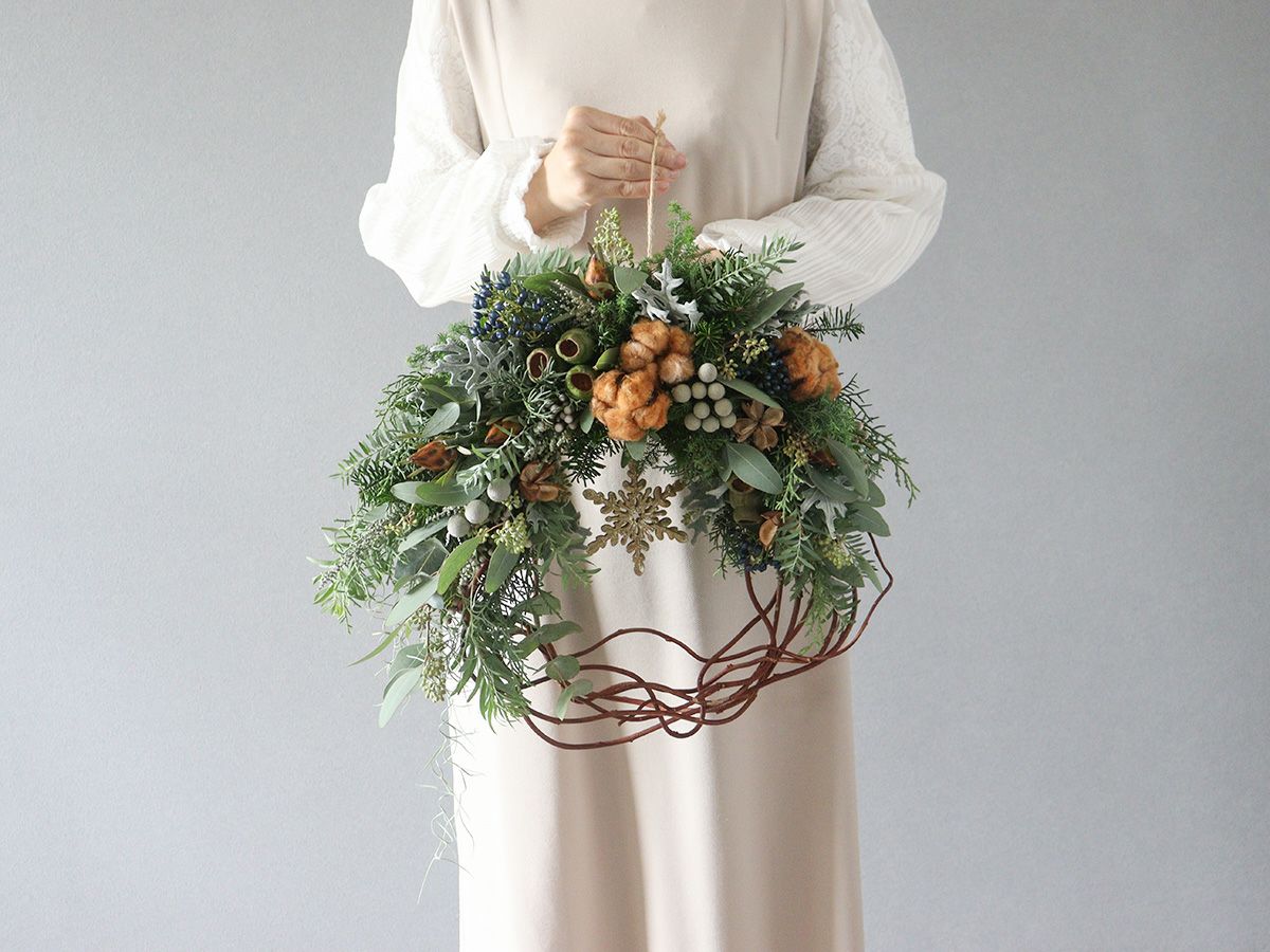 たっぷりの針葉樹やユーカリのグリーンにブラウンのコットンフラワー、リューカデンドロン プルモサムなど、季節の世界の草花をお入れしたナチュラルリース。森の香りが優しく漂います。フレッシュの状態でお届け、ドライフラワーへ移り行く様子をお楽しみいただけます。