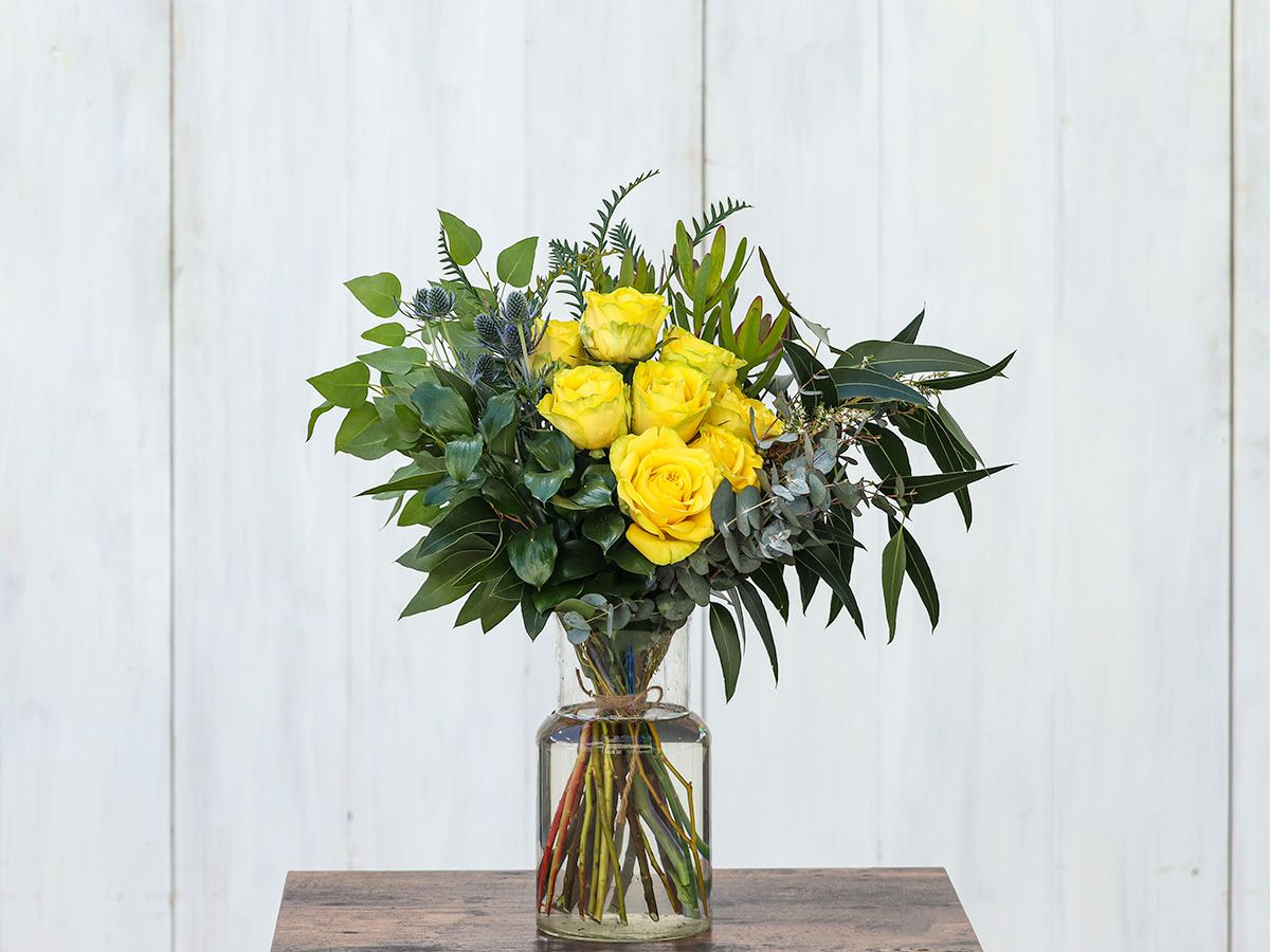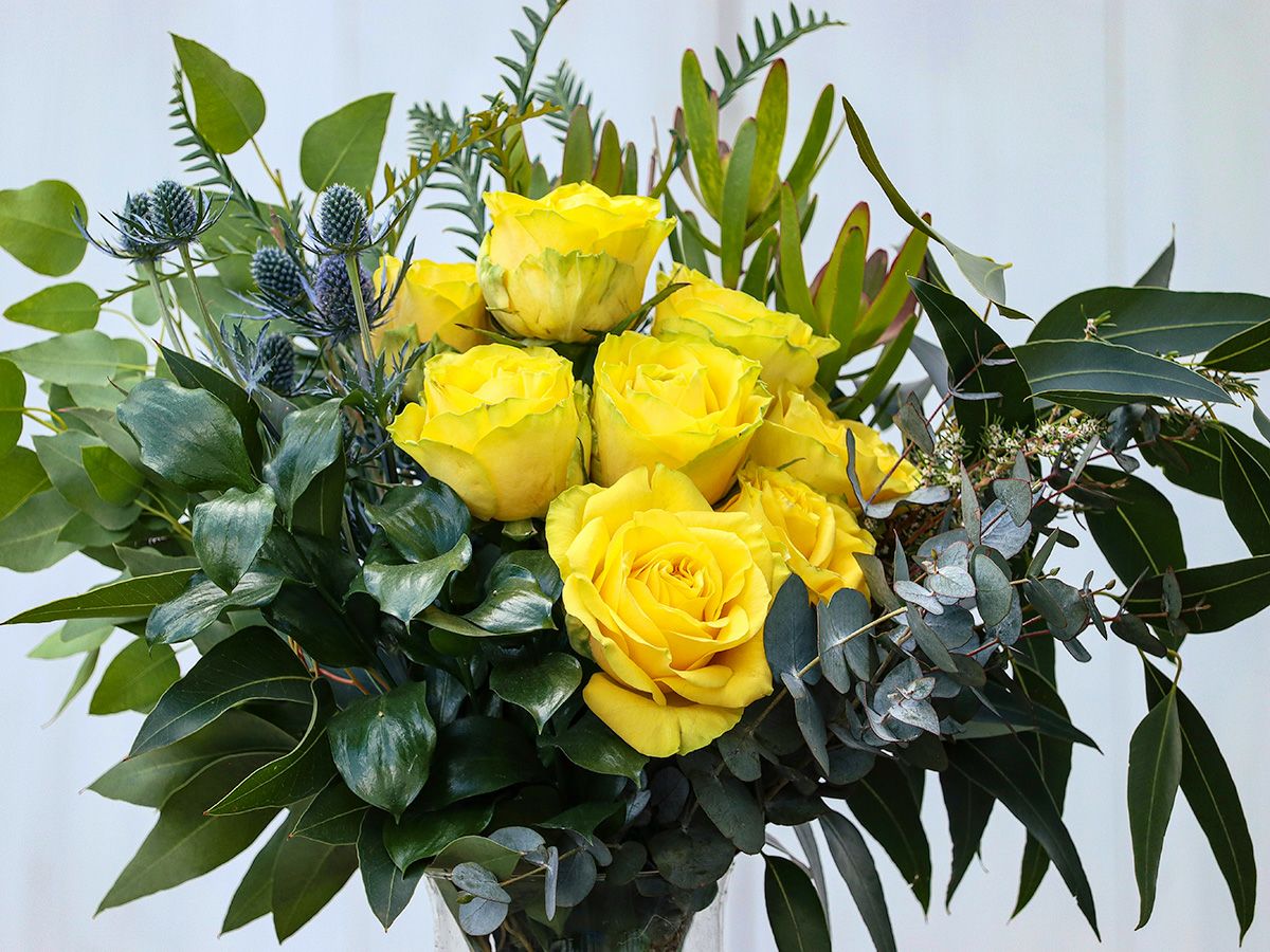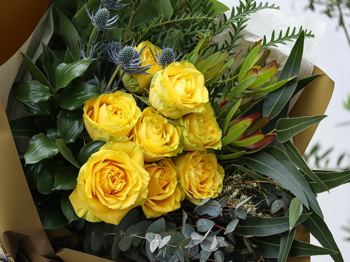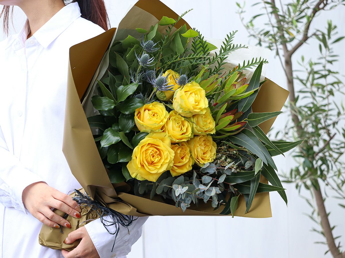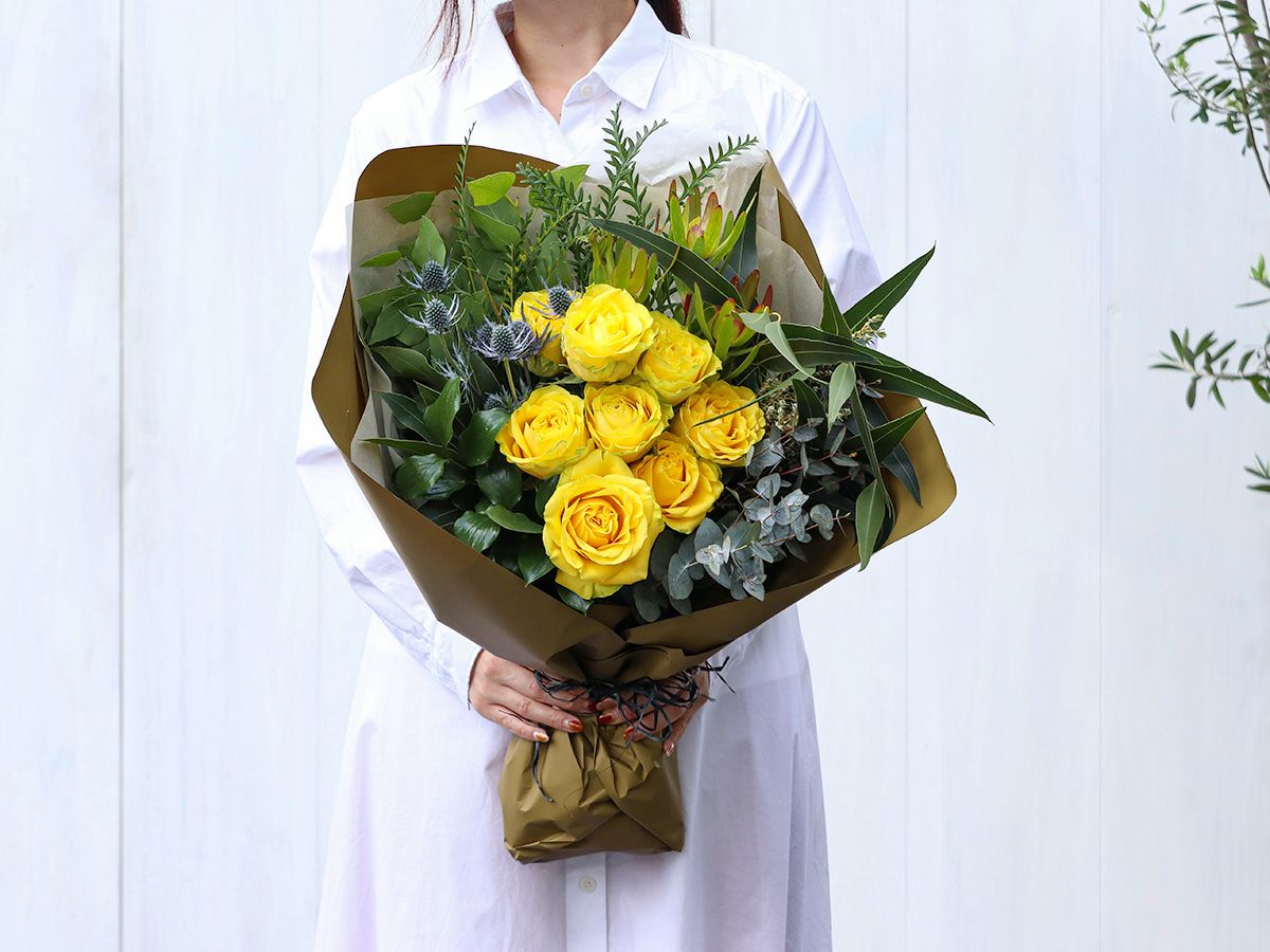 美しいイエローカラーが引き立つように草花をセレクトし、ナチュラルに束ねました。
